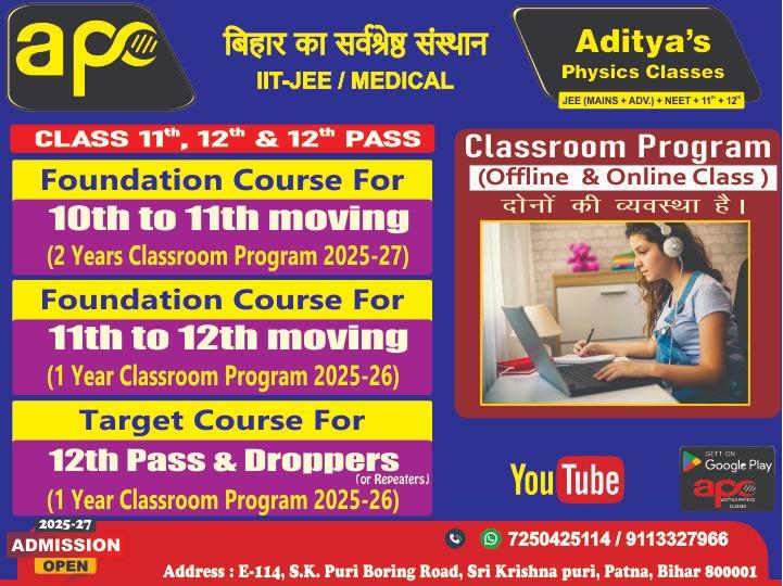 Aditya Physics Classes is the Best IIT, JEE, Mains, Advance Physics Coaching Institute For top 10, No 1, Famous Physics Tutorial of XI & XII in Boring Road, Patna, Bihar